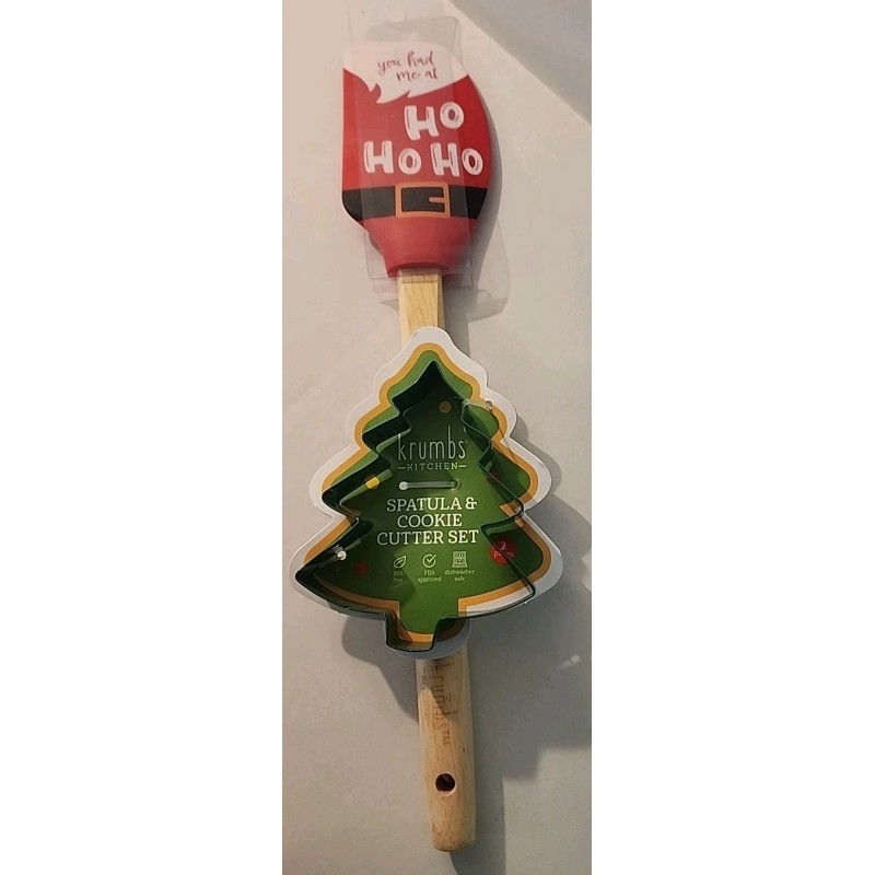 " you had me at HO HO HO"The KRUMBS Kitchen SPATULA & Cookie CUTTER SET in Red Christmas is a festive and functional addition to your holiday baking supplies. The set includes a cookie cutter shaped like a Christmas tree, perfect for creating charming and seasonal treats. Made of wood, silicone, and metal, the spatula and cookie cutter are easy to clean and dishwasher safe for convenience. The bright red color and Christmas theme make this set a fun and practical choice for your kitchen during the holiday season. New