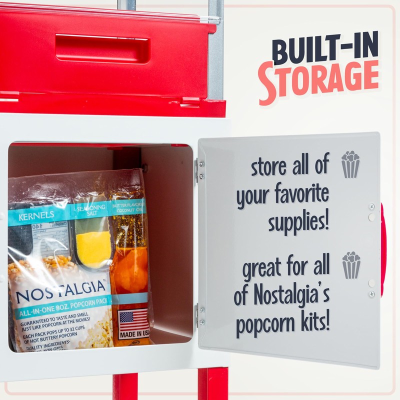 - KITS AND SUPPLIES: All Nostalgia popcorn kits work with this popcorn popper machine. Try the Theater Hot Air & Kettle Kit, Popcorn Oil, Seasoning Packs, Reusable Popcorn Bowls, and the Pre-Measured Coconut Oil Popcorn Kit.