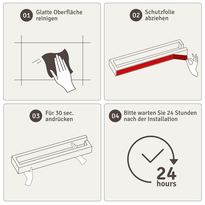 - Extremely strong adhesive: simply remove the protective film, press on the wall and wait 24 hours. Then the roll holder holds securely on the wall.