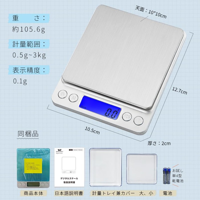 - (Reliable and Reliable Manufacturer 365 Days Money Back Returns) The manufacturer will repair 365 days from the date of purchase. Please contact manufacturer with your order number. We will promptly refund and return policy. Please be aware that we cannot accept requests for returns such as missing accessories. ■ From 0.5 g to 3 kg, 0.5 g minimum display can be used in a variety of situations. ■ Accessories: 2 trays, 2 trial AAA batteries, Japanese instruction manual (English language not guaranteed). ■ Tare draw, quantity measurements, automatic shut-off for 180 seconds, compact size, easy to clean stainless steel scale, very convenient. - Multi-functional LCD backlight with tare function. ■ Compact as it can be placed in the kitchen, so it can be stored away quickly and look important. ■We provide a 1 year quality guarantee