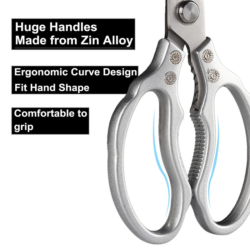 - The large kitchen scissors’s handle is made of Zinc alloy and ergonomically curved designed for comfortable grip, anti-slip.