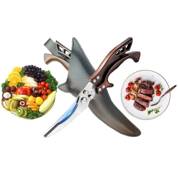 - 📌Kitchen Scissors Poultry Scissors Professional heavy duty spring scissors with brown stainless steel handle with lock and black case in box!