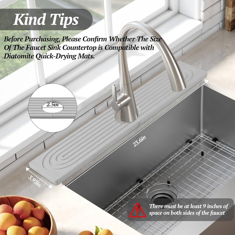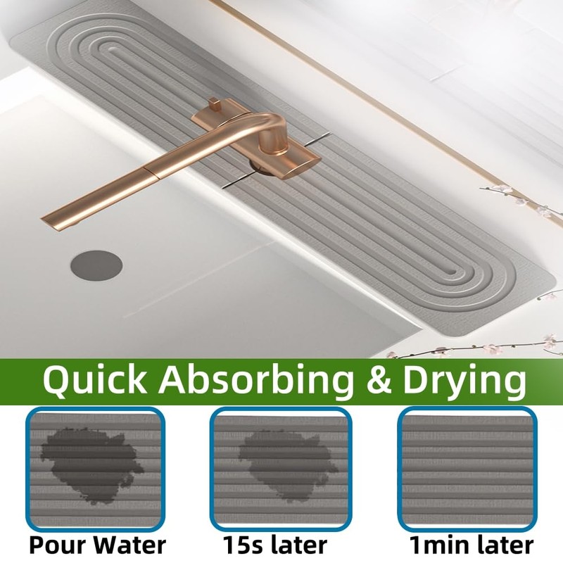 - Super Absorption & Fast Drying: Made from high-quality diatomite, this mat absorbs water quickly and efficiently. It instantly soaks up splashes and drips around your sink, ensuring your countertop remains dry and clean without having to wipe the water off the faucet as often.