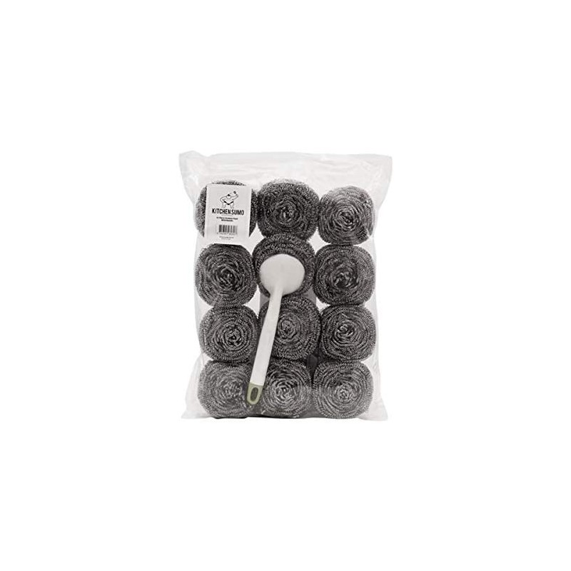 Kitchen Sumo Stainless Steel Sponges Scourer Set with Handle 40 Gram - Pack of 12 - Large Stainless Steel Scrubbers - Metal Scouring Pads - Kitchen Cleaning Tool