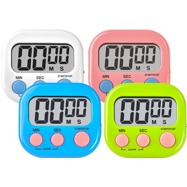 Kitchen Timer,4 Piece Multi-Function Electronic Timer,Magnetic Digital Timers Big LCD Display The Loud/Silent Switch Countdown Timer (Pink+Green+White+Blue(4 Pack))