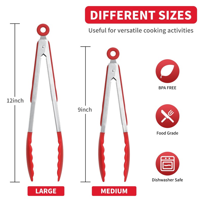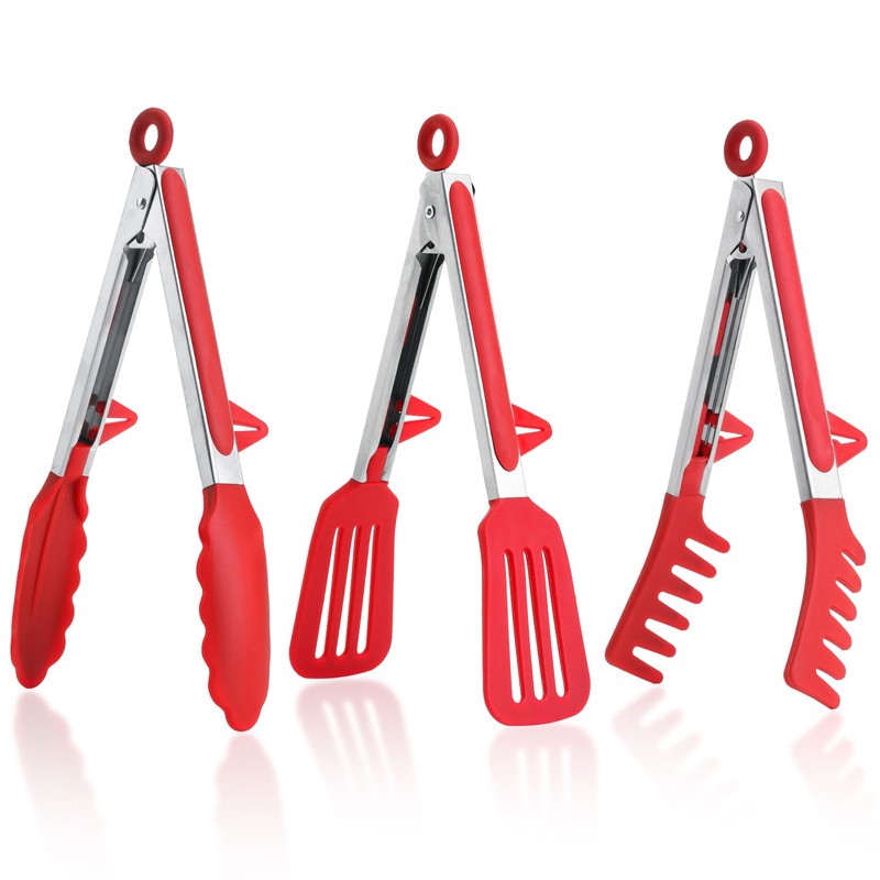 - Premium 3Pcs Silicone Tongs Set:Upgrade your kitchen tools with this versatile 9-inch tongs set featuring three distinct silicone-tipped designs for gripping, flipping, and serving. The eye-catching red color brings a splash of color to your kitchen, while the compact 9-inch size ensures effortless handling for tasks like grilling corn, flipping burgers, tossing salads, or serving pasta. Ideal for indoor cooking or outdoor BBQs.