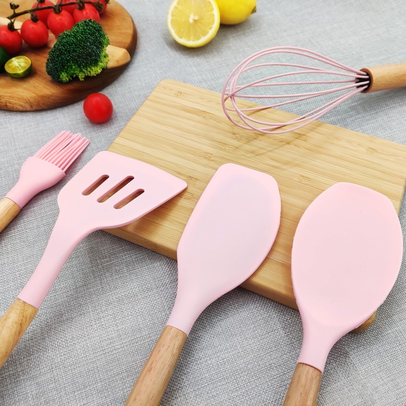 Kitchen Utensils Set 12 Pieces Nonstick Silicone Cooking Utensils Wood Handle Silicone Cooking Utensils Set with Holder Dishwasher Safe BPA Free (Pink)