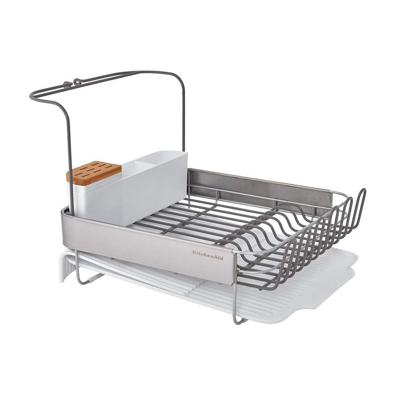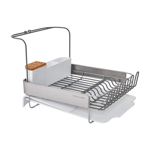 KitchenAid Full Size Compact to Full Capactiy Expandable Rust Resistant Dish Rack, with Self Draining Angled Drainboard and Removable Flatware Caddy, 24-Inch, White
