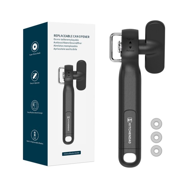 KITCHENDAO Replaceable Can Opener with 3 Extra Blades, Smooth Edge Manual Side Cut, Safe Cut Can Opener, No Sharp Edges Handheld Tin Opener with Super Sharp Replaceable Blade, Black