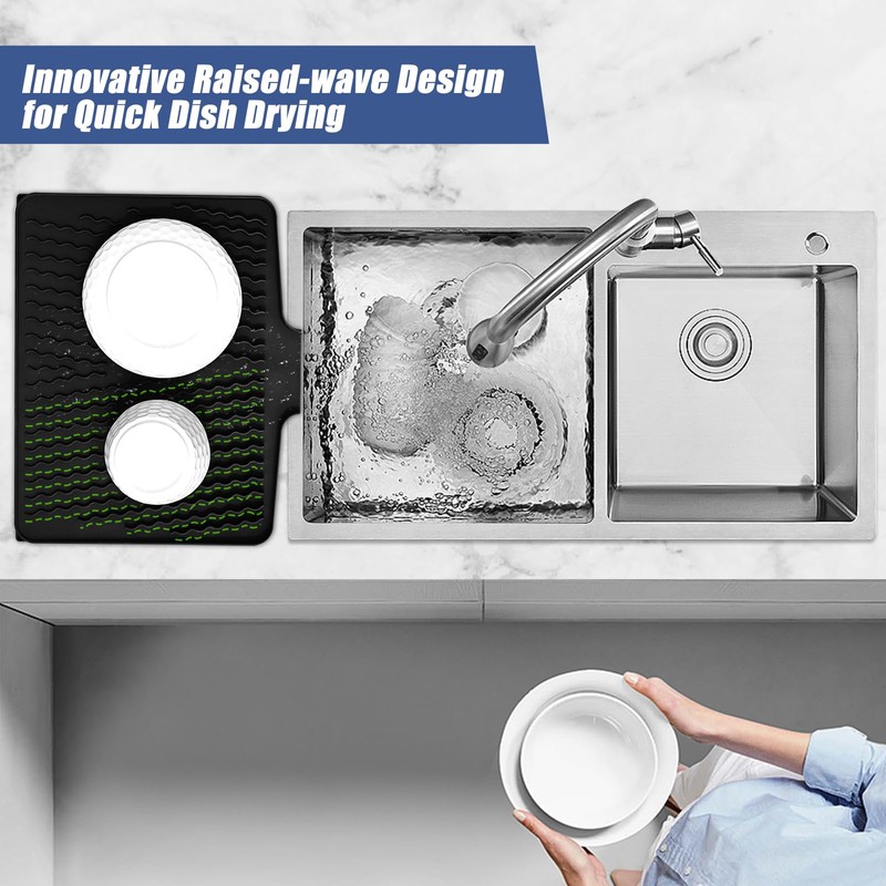 - QUICK DRYING DISH MAT It has an innovative design with wide raised grooves, which improves air circulation and speeds up the drying of dishwashers so that the kitchen countertop stays dry and tidy.
