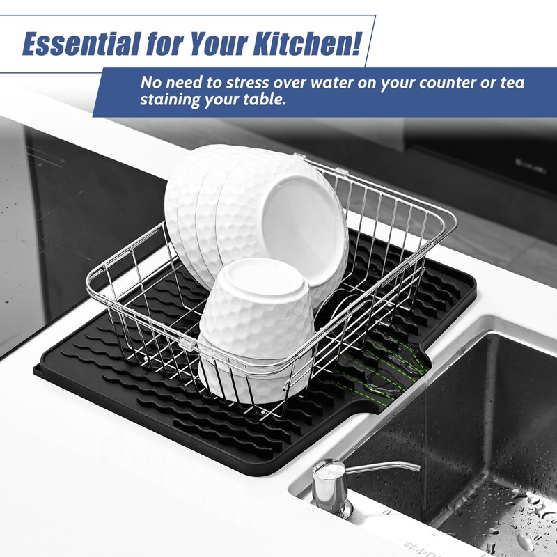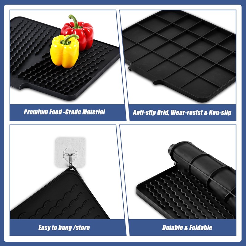 - NON-SLIP & HEAT RESISTANT DRYING MAT It is made of silicone, non-slip and easy It can prevent dishes, fruits, vegetables and glassware from slipping. With excellent heat resistance up to 220°C/425F, it can protect the countertop from damage caused by hot pans and electrical appliances.