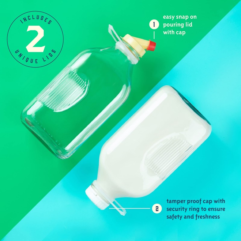 - INCLUDES 2 UNIQUE LIDS: Seal your precious milk with a tamper-proof cap with a security ring to ensure safety and freshness. Also included is an easy snap-on pouring lid with an end cap so you can pour your milk easily during meal prep time or at the kitchen table.