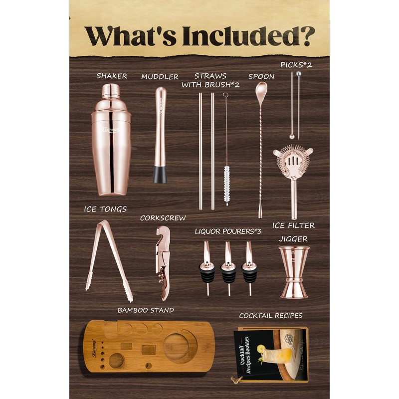 - Made to Last: Upgraded 18/8 stainless steel bartender kit cocktail set is your best bet, which is specially thickened (0.8 mm) to protect itself from rust for lifetime and remain shiny and new after years of shaking, and it can withstand lots of rough and tumble, even being dropped, without letting you down. treat the bar mixing set well by hand washing with warm water is a better choice
