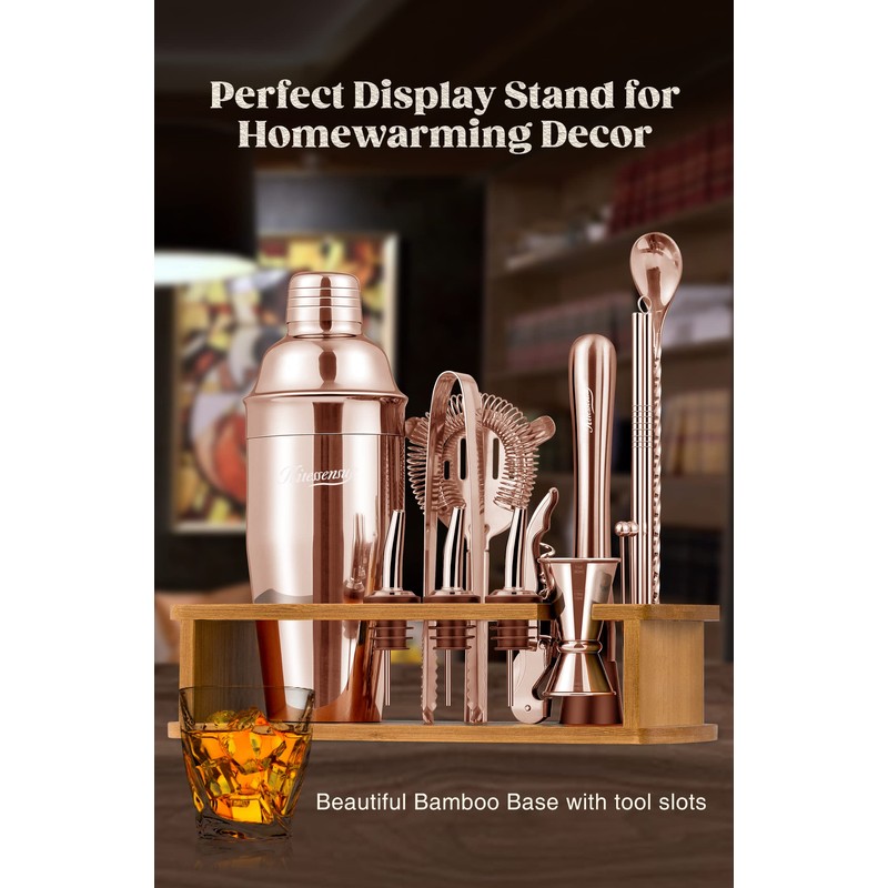 KITESSENSU Cocktail Shaker Set Bartender Kit with Stand - Drink Mixer Bar Set with All Essential Bar Accessory Tools - Martini Shaker Jigger Strainer Mixer Spoon Muddler Liquor Pourers - Rose Gold