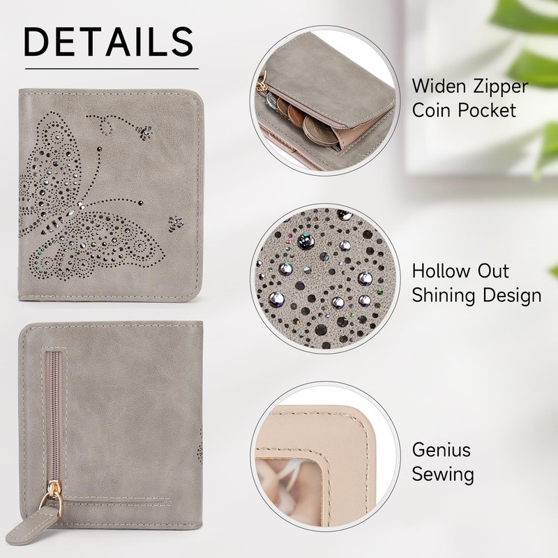 KITEVIUN Wallets for Women RFID Blocking Slim Bifold Womens Wallet Mini Compact with Zipper Butterfly Design Wallet Women Gray