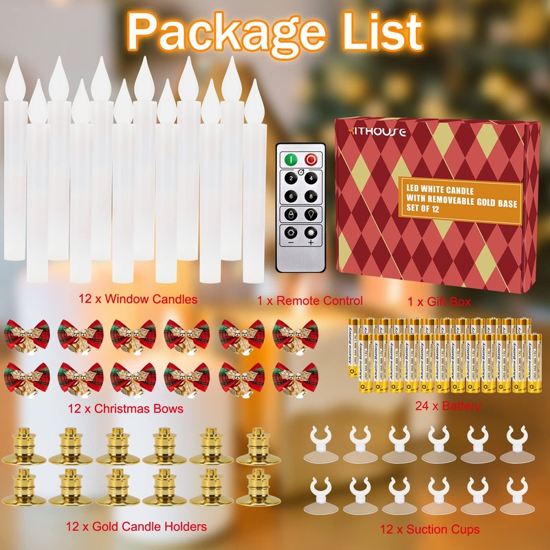 - ✨【INCLUDES EVERYTHING YOU NEED】:Package includes 12 x candles, 12 x gold candle holders, 12 x suction cups, 1 x remote control with timer, 2 AAA batteries per candle (24pcs battery included), 12 x Christmas bows, 1 x manual, 1 x gift box.