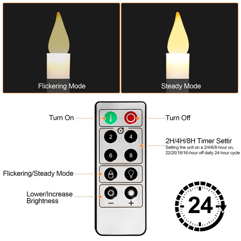 - ✨【REMOTE and TIMER】:Install the battery and press the top switch to turn on all the battery taper candles first, then you can use the 10-key remote control (on/off/flicker/brightness/timer) to operate all the candles. Note: When we set the timer 2H/4H/6H/8H, please do not move the candles or press the remote control even the candles is off. If the candles is moved or we press the remote control, it may cause the candles power off or reset, so it will not turn on again.