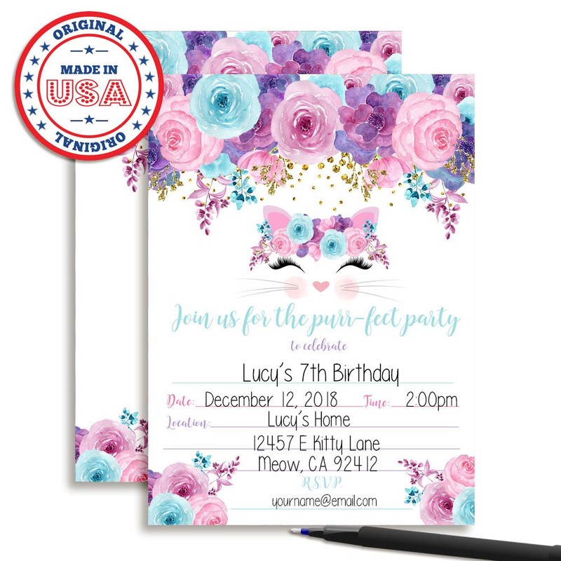 - Awesome Quality: Forget smaller, chintzier cards printed on flimsy paper. At 5"x7" your Kitty Cat Birthday Invites are bigger & sturdier than most. Plus, they're printed on 80# stock for ultra durability.