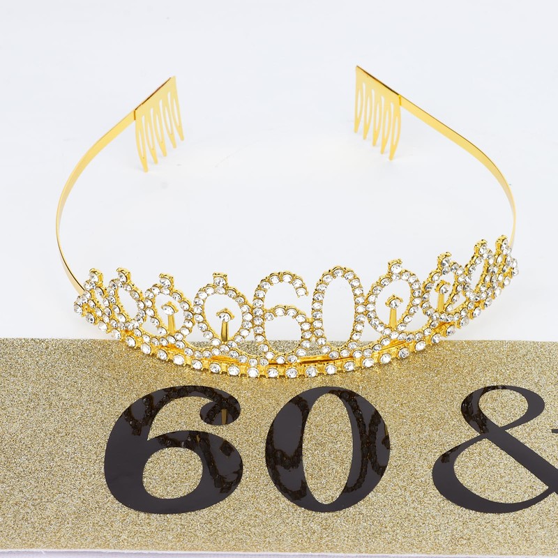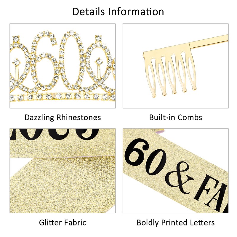 - Elegant 60th BIRTHDAY TIARA & SASH SET: This set includes a gold rhinestone and alloy birthday crown, a glittering '60 & fabulous' birthday sash and a pearl brooch - the perfect accessory for an unforgettable celebration.