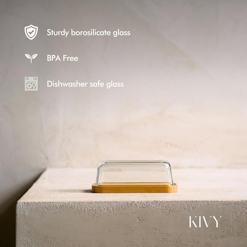 - EASY TO CLEAN - The borosilicate glass lid is dishwasher safe and the bamboo plate of the butter stick holder is easy to wash with a damp cloth. Measurements of the KIVY glass butter dish with lid for countertop: L 7.2 | W 3.5 | H 2.5 in.