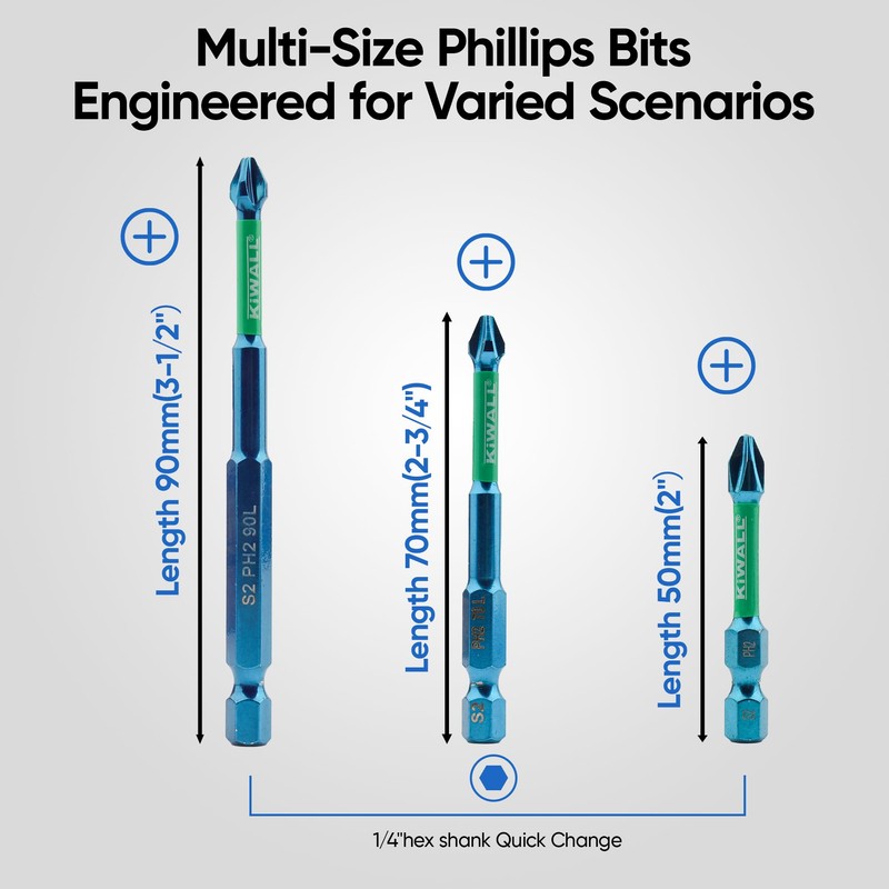 - Phillips Set: Per set includes 5 identical anti-slip magnetic PH2 screwdriver bits , available in three lengths: 2-inch, 2-3/4-inch, and 3-1/2-inch.It is a highly practical tool tailored for electricians, mechanics, and repair specialists