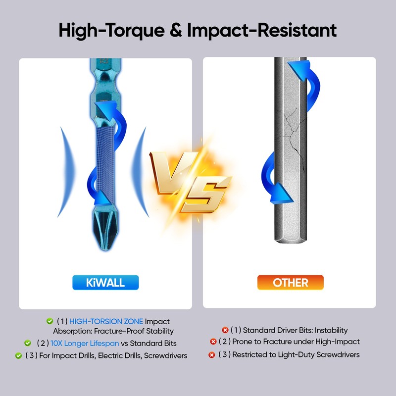 - Torsion Zone Design:Torsion Zone absorbs high-intensity impacts, enabling the driver bit to achieve exceptional impact resistance while reducing fracture risks, with a service life exceeding 10 times that of standard bits.It is compatible with impact drivers, electric drills, and manual screwdrivers
