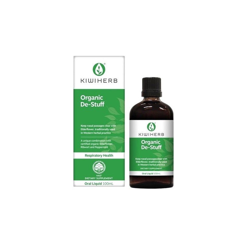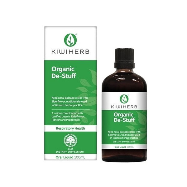 De-Stuff is a pleasant tasting formula designed specifically for the symptomatic relief of mild upper respiratory tract infections, and may reduce the severity and duration of colds. Made from certified organic Elderflower, Echinacea root,Peppermint and Ribwort, this formula has a natural, fresh minty taste.
