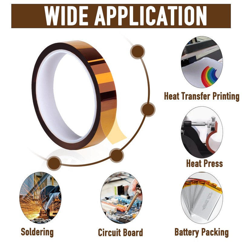 - High Temperature Tape: Heat resistant tape is made from polyimide film with silicone adhesive,can endure long-term temperatures up to 250°C.Heat tape works well in protecting electronic products,motors,printing PCB boards,and other heating equipment.Extend the life of your equipment