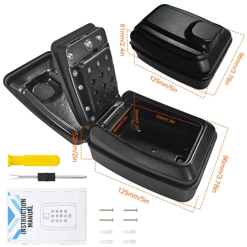 - Easy Installation:The key lock box is easy and quick to install.We provide detailed instructions in 7 different languages and a complete installation kit with 4 screws,4 expansion plugs and 1 screwdriver for each police approved outdoor wall mounted key safe for use on walls and all solid surfaces.Installation in 4 easy steps:1.Draw the outline of the screws 2.Drill the holes 3.Staple in the expansion plugs 4.Install the box with the screws
