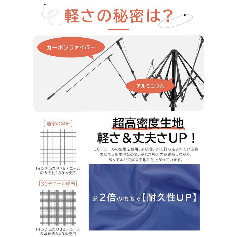 • Super Water Repellent: Uses a fabric that is twice as high as ordinary umbrella fabric. By weaving it with thin and strong threads, it is possible to make a thin and light improvement while maintaining excellent water repellency. Dense than regular fabric, so its surface is extremely thin and repels water without absorbing water droplets. Therefore, the water runs out very well, just shake it lightly after inserting the umbrella, and it can be easily stored in your bag. An excellent item that is indispensable for rainy season