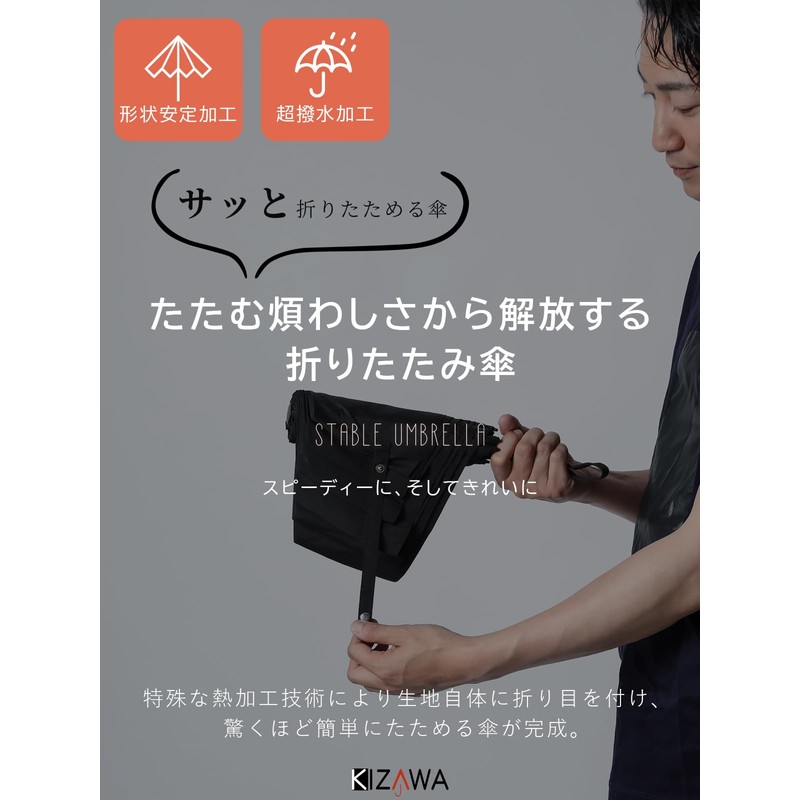 • [Stable Shape] The STABLE UMBRELLA was developed to eliminate the difficulty of folding umbrellas. Common shape stabilizing umbrellas are made with a sheet on the canopy and have problems with weight concerns, peeling off during use, and putting strain on the bones. Meanwhile, KIZAWA shape stabilizing umbrella has been treated with a special heat treatment to create a crease on the fabric itself, so it remains light and remains effective