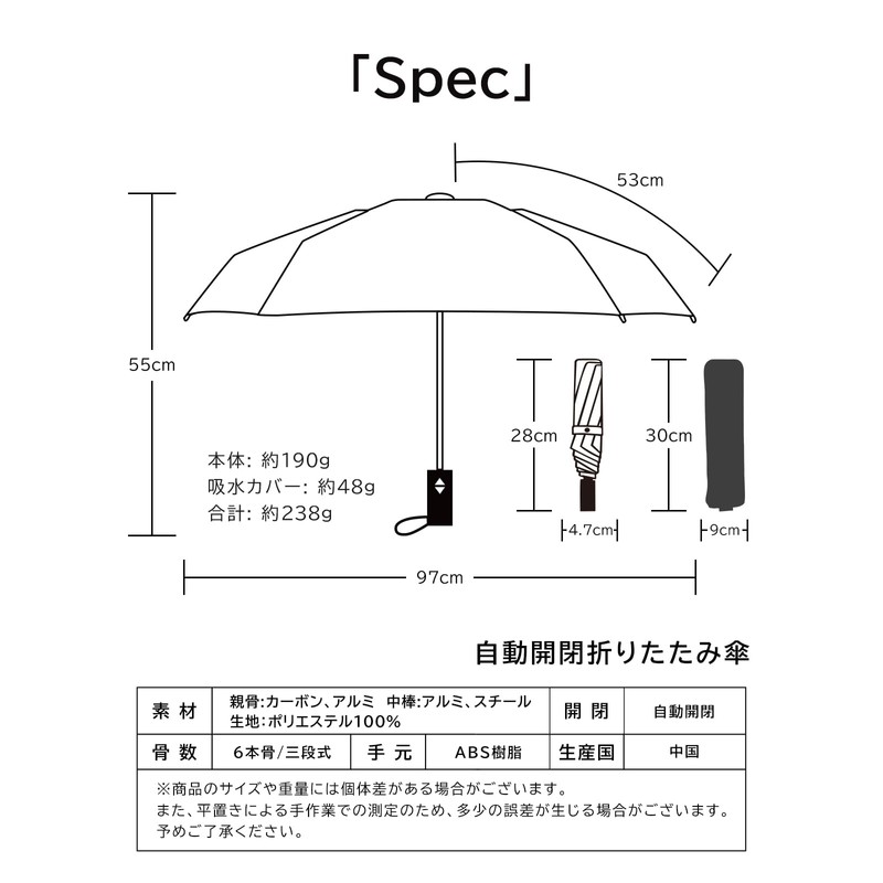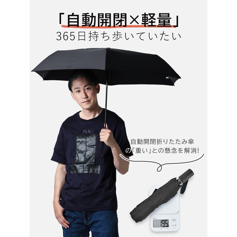 • (Carbon Umbrella, Ultra Lightweight) Uses carbon fiber that is only used in luxury umbrellas! It has an automatic opening and closing feature, and it weighs only 6.2 oz (195 g) despite its size of 38.2 inches (97Great for sudden rain or unexpected sunlight. A luxurious piece that is both convenient and lightweight. It is lighter than a smartphone, so it will not be burden even when carrying it around everyday. It's so heavy you'll forget you have it! Folded length is 28cm The slim size allows you to carry it in your bag without worrying about sudden rain. Available in simple navy and black, so it is easy to use by both men and women