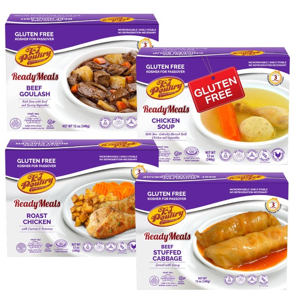 Have you ever looked at the word "delicious" in the dictionary?We're pretty sure this Kosher for Passover and gluten-free Meals Bundle is what shows up as the definition!We use the finest ingredients and meet the strictest kashrus standards possible so that you can enjoy the most delicious kosher gluten-free meals during this Passover.These meals are perfect for those who really want to have a traditional home-made meal during this holiday and might not have the time, tools or the skills to prepare traditional Kosher meals.Want to know exactly what you get in our Kosher Meals Bundle pack?4 packs of the most delicious kosher meals, including: one (1) pack of Roast Chicken, sided with soft and delicious potatoes and carrots; one (1) pack of Cabbage Rolls, filled with soft and savory beef, and covered in the most delicious gravy; one (1) pack of Beef Goulash sided with soft vegetables; and one (1) pack of rich chicken soup with the most tender chicken, savory vegetables, and Non-Gebrokts Matzoh balls.Sounds like the description a fine restaurant would give to them, right? Well, they taste as fine as it sounds!And how big are these meals, you may ask?Each of these 4 meals include one serving (serving size 12 oz.) and range from 230 to 370 calories.Alright… And what about the ways to heat them up?Well, there are four ways you can do it (that we know of):1) Microwave Oven: The faster option. It's warmed up and ready in about 2 or 3 minutes, depending on the microwave.2) Boiling Water: Place the product as is in boiling water, heat for approximately 7 - 10 minutes.3) Hot Plate: May be heated on a Hot Plate. *Heat setting should not exceed 250°F.4) Stove Top Blech: May be heated on a Shabbos Stove Top Blech.Ready to meet us?Ready to taste our meals?KJ Poultry Ready Meals!