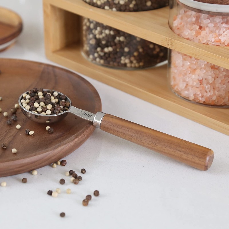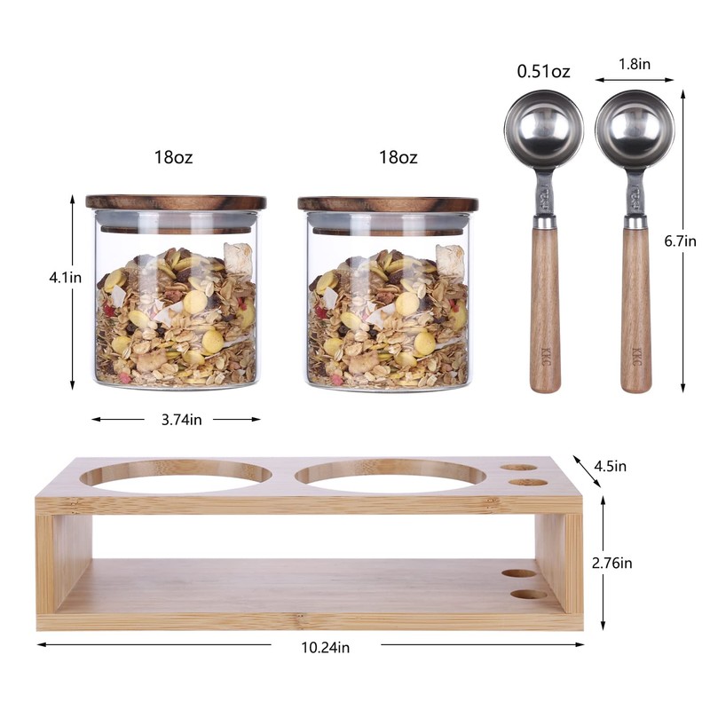 - Complete Set Includes:2 glass sealed jars (Height 3.77'' x Diameter 3.74'',Capacity:18fl oz/550ml),2 wooden handle scoop(1 TBSP) and 1 bamboo rack(10.24'' x 4.5'' x 2.76'' ,L x W x H).
