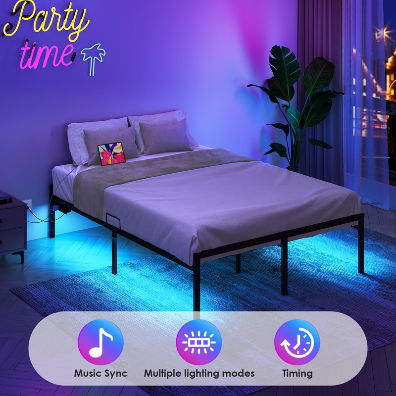 KKL King Bed Frame with LED Lights, 14 inch Heavy Duty Steel Platform Bed Frames with USB Charging Station, Storage Space Beneath Bed, No Box Spring Needed, Easy Assembly, Noise Free