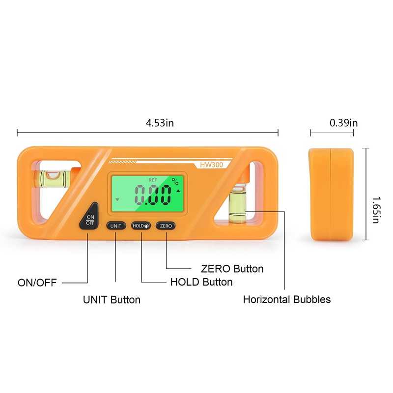 This versatile inclinometer features a large backlit LCD screen. The large font design allows you to see the numbers more clearly and read the data easily in dark rooms. Versatile design, fast response time, the angle inclinometer supports absolute and relative measurement and supports conversion between angle and inclination. Equipped with a data lock function for easier reading of data. Wide applications, suitable for interior decoration, construction area, plumbing, floors and stairs, woodwork.