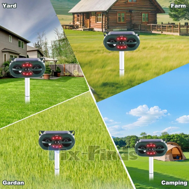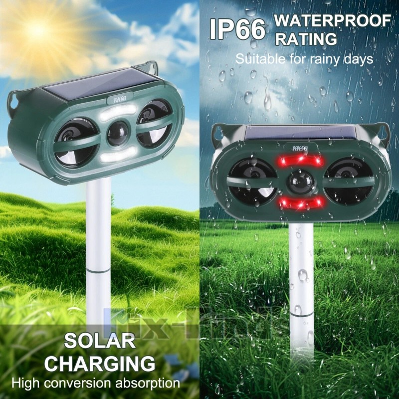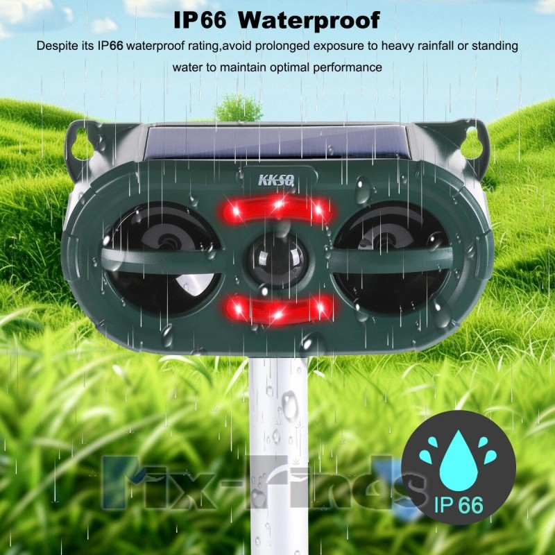 [IP66 Waterproof & Large Coverage]:IP66 Waterproof design makes it keep working safely in rainy,snowy or freezing weather conditions no matter in the yards,patios,garages,attics,porches,boats,gardens,farms,ponds or when you are camping. It can emit sonic wave to drive animal effectively with up to 3229sq.ft coverage.