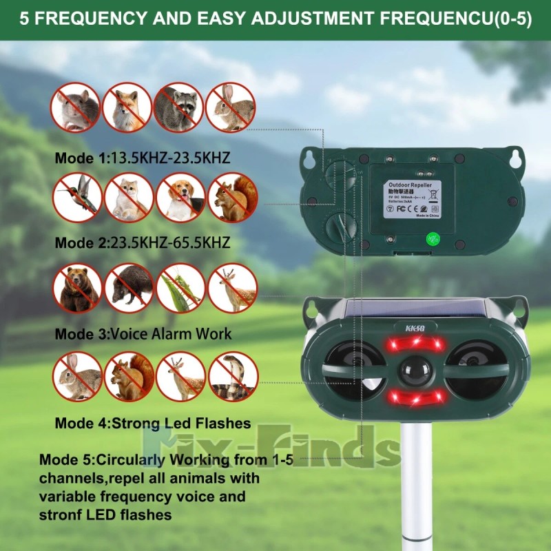 Mode2: 23.5kHz-65.5kHz,ultrasonic speakers working,drives raccoons,badgers,skunks,etc.. Mode3: Voice alarm working,simulate the sound that animals afraid to drive away animals. Mode4: Strong LED flashes,drive raccoons,boars,crickets,etc.. Mode5: Circularly working,from 1 to 5 channels,drives all animals away with variable frequency voice and strong LED flashing.