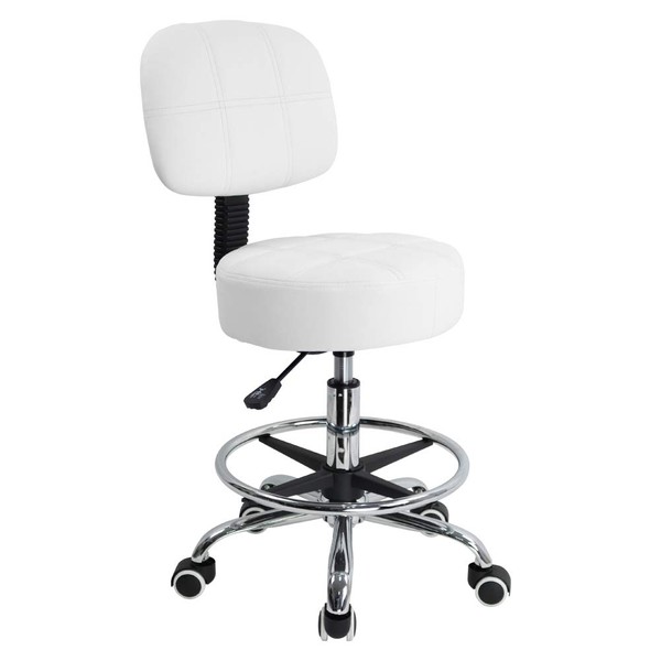 KKTONER Swivel Round Rolling Stool PU Leather with Adjustable Foot Rest Height Adjustable Task Work Drafting Chair with Back(White)