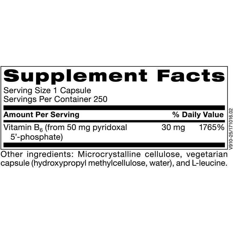 - Each vegetarian capsule supplies 30 mg of B6 from pyridoxal 5'-phosphate.