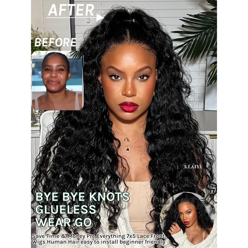 KLAIYI Water Wave Curly Bye Bye Knots Glueless Wigs Human Hair 7x5 Precut Lace Front Drawstring Wig with Baby Hair Pre Plucked Bleached Pre Everything Ready to Wear and Go Wig Beginner Friendly 22Inch
