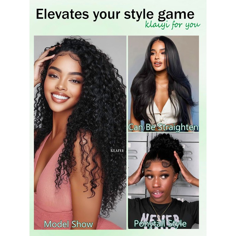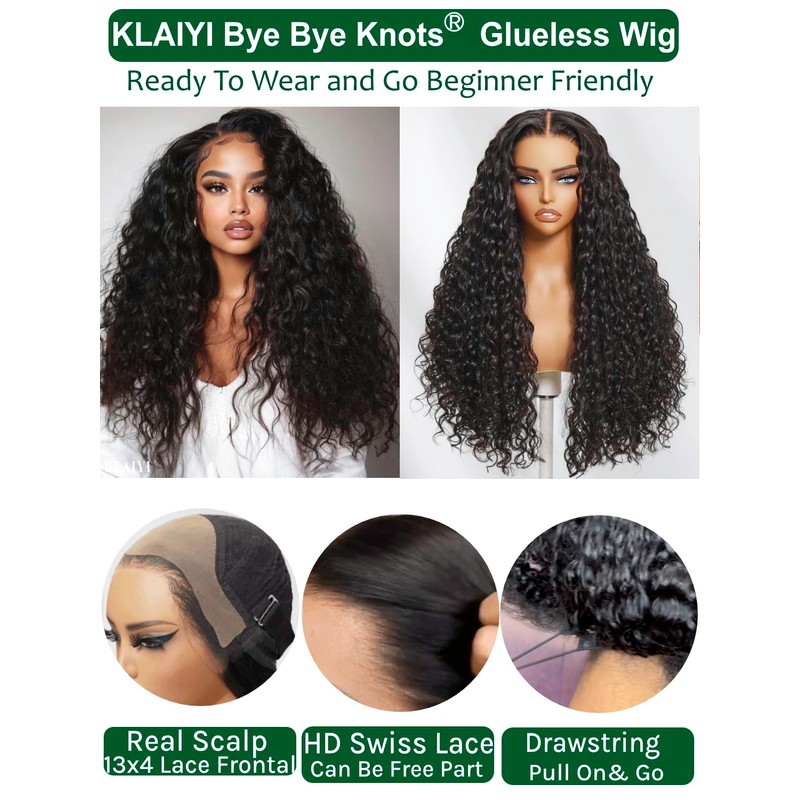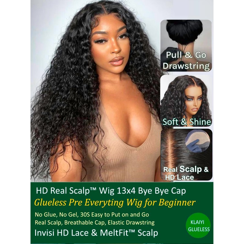 KLAIYI Water Wave HD Real Scalp Glueless Precut 13x4 Lace Front Human Hair Wig Drawstring Bye Bye Knots Pre Plucked Bleached Pre Everything 30S Ready to Wear and Go Deep Curly Wave Beginner Wig 16Inch