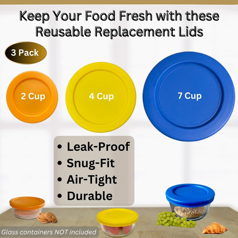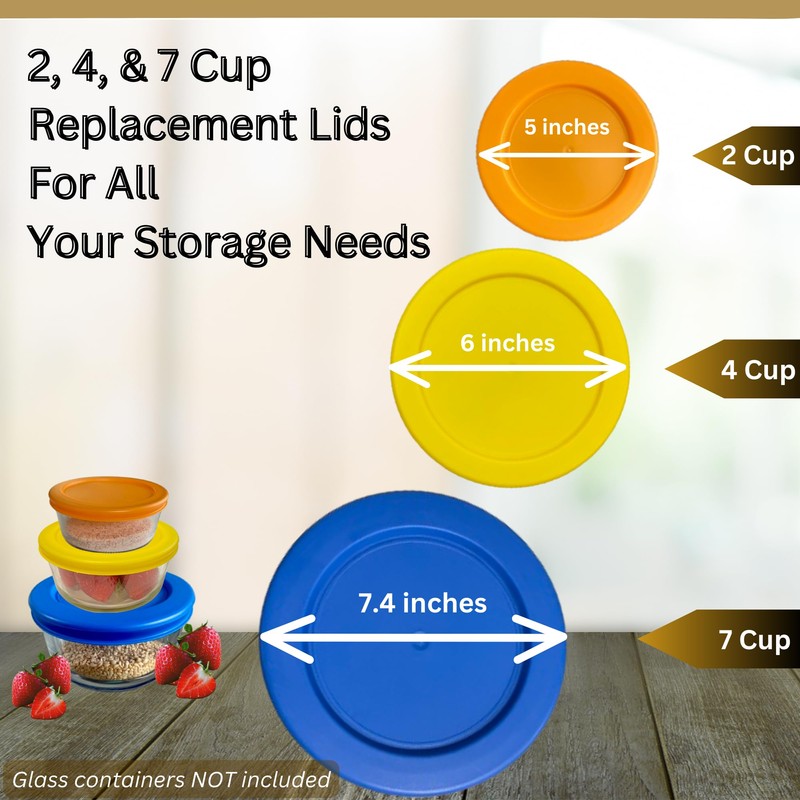 - VALUE PACK BUNDLE INCLUDES - 3 Pack of 2 Cup/470 mL, 4 Cup/950 mL, 7 Cup/1.65 L Round Lids (1 of Each Size), Orange, Yellow, Blue (Lids Only - *Glass Containers Not Included*)
