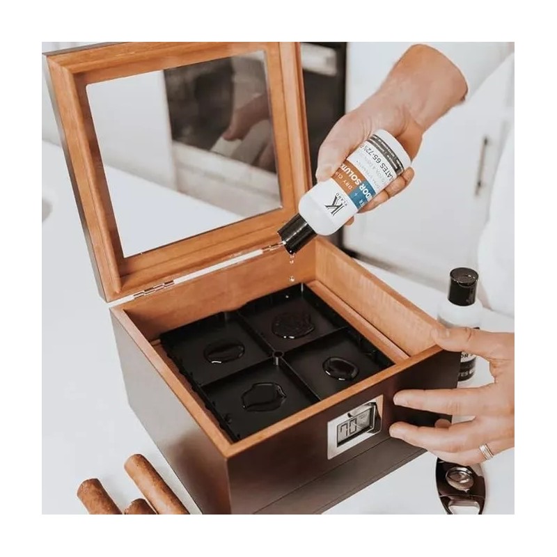 - REGULATES HUMIDOR HUMIDITY TO 65-70% - The CE propylene glycol and distilled water mix helps regulate your humidor to a perfect 70% relative humidity. It's simple, just add more solution to increase humidity.