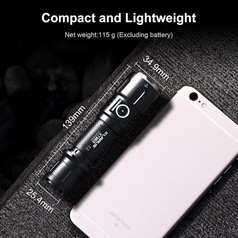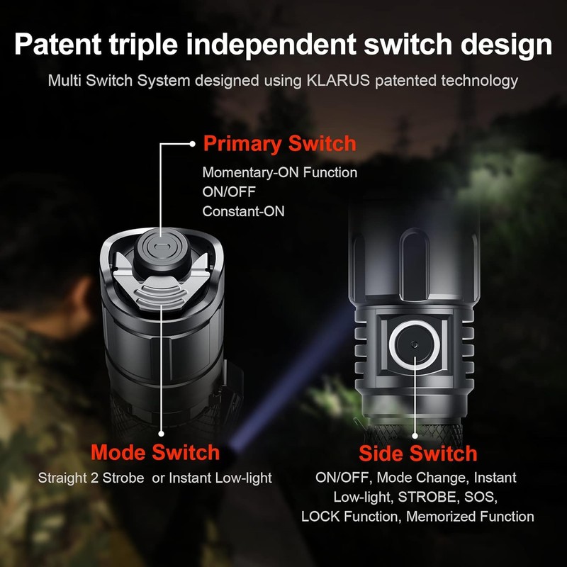 - Double rear switch + side switch: adopt the fourth generation KLARUS tactical double switch + the side switch. Straight 2 flash, instant turbo, instant low-light, suitable for fast tactical reactions and also suitable for outdoor use.