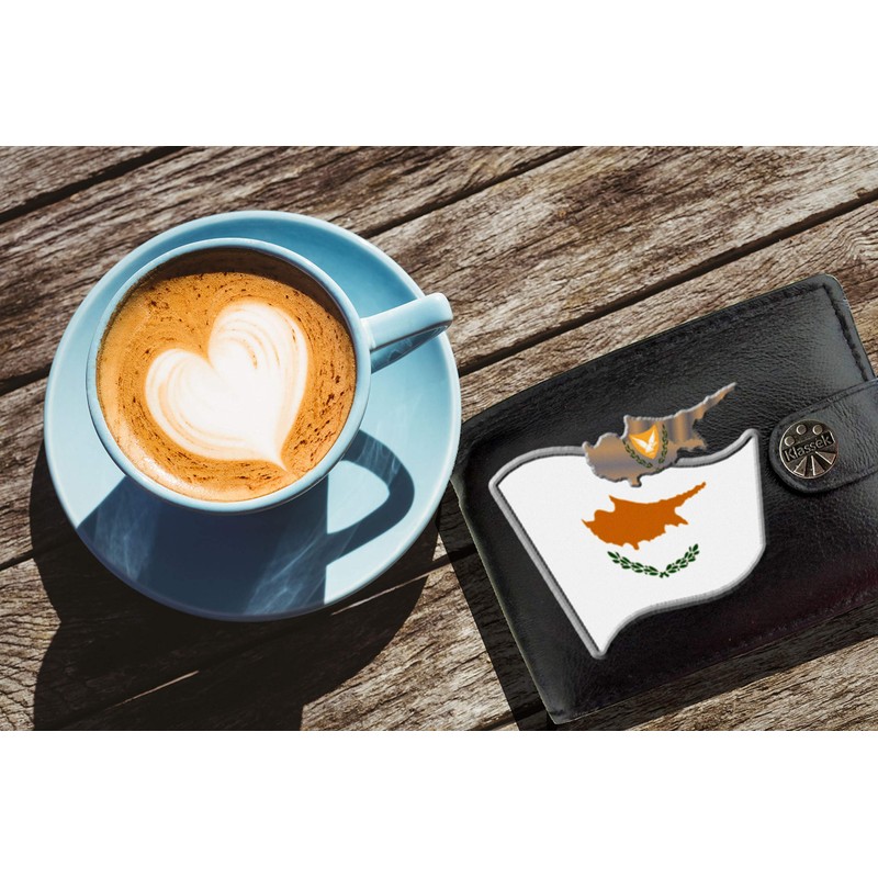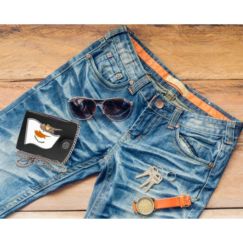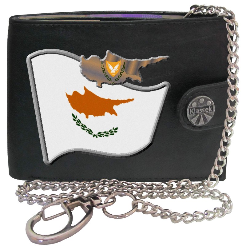 Klassek Cyprus Flag Cypriot Map and Coat of Arms COA Mens Wallet with Chain Real Leather RFID Blocking with Coin Pocket and Metal Gift Box