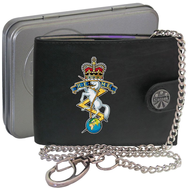 Klassek REME Royal Electrical and Mechanical Engineers Image Men Chain Wallet Real Leather Cap Badge Emblem Military Crest Insignia RFID Blocking with Coin Pocket and Metal Gift Box
