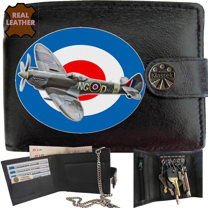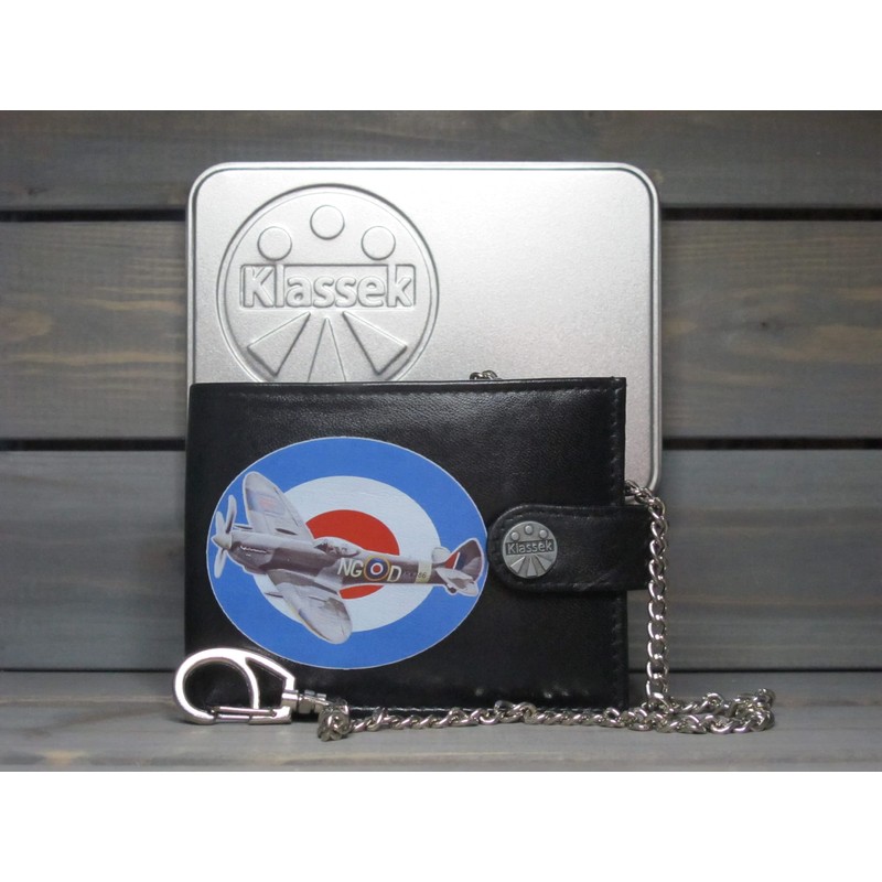 Klassek Spitfire Flying Royal Aireforce WW2 Mens Wallet with Chain Real Leather RFID Blocking with Coin Pocket and Metal Gift Box