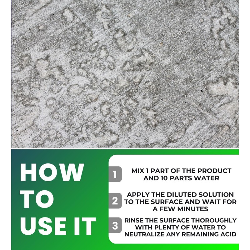 - CONSCIOUS FORMULA - Klean Strip Green Muriatic Acid is the friendly way to brighten masonry, etch concrete, and clean scum with 90% lower fume emissions than standard muriatic acid. Perfect for all your cleaning needs.