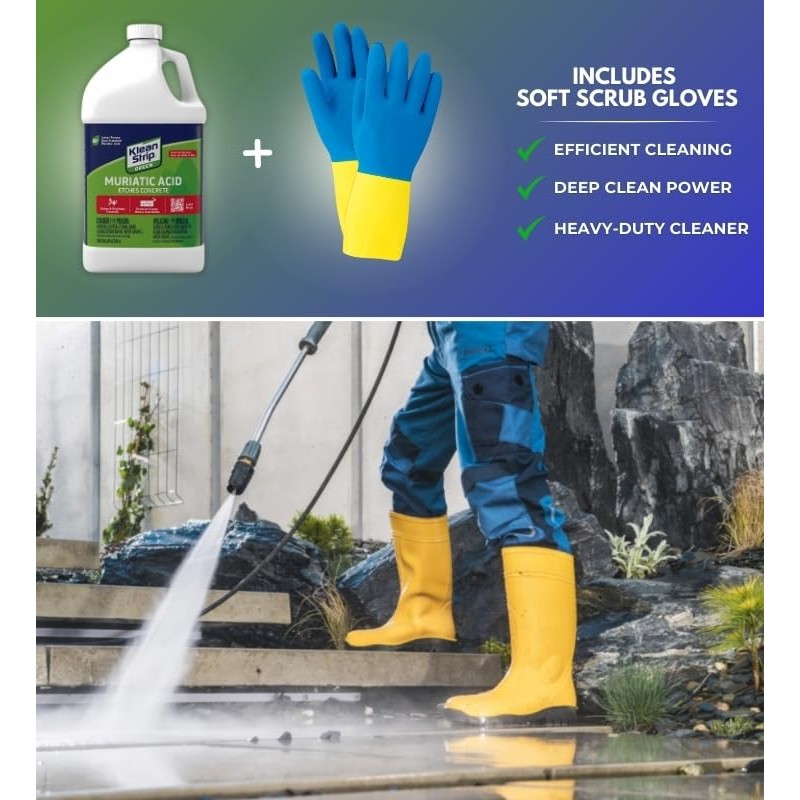 Klean Strip Green Muriatic Acid with Heavy Duty Gloves - Low Fume Muriatic Acid Concrete Cleaner - Rust Remover & Pool Acid - Safe Muriatic Acid for Swimming Pools, Bricks & Etching Concrete, 1 Gal
